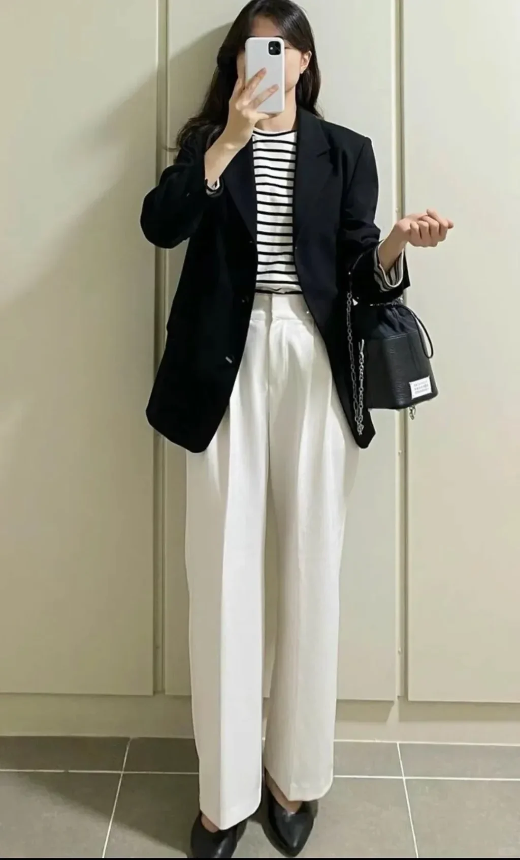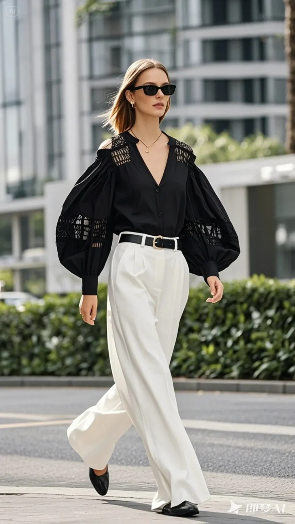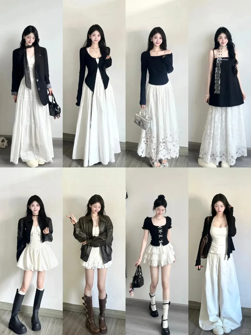 - ลุคทำงาน (Workwear) เสื้อเชิ้ตขาวเรียบใส่คู่กางเกงสแล็กดำ หรือเดรสขาวทับเบลเซอร์สีดำ เหมาะสำหรับวันที่ต้องการความมั่นใจและความสุภาพ