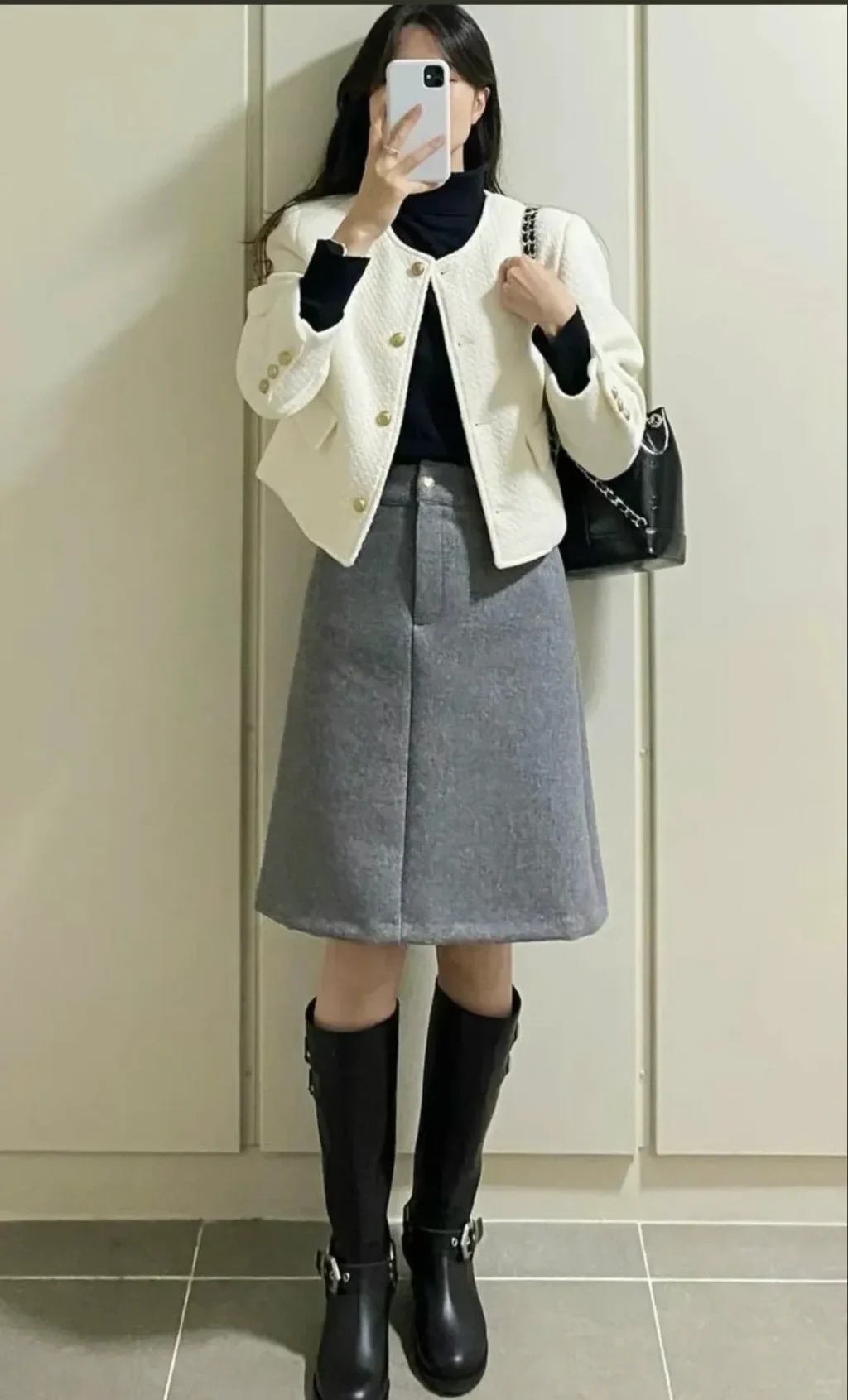- ลองใช้เสื้อเบลเซอร์ผ้าทวีดทับชุดเดรสเรียบสีขาว เพื่อเพิ่มเลเยอร์และบุคลิกที่ดูมั่นใจ