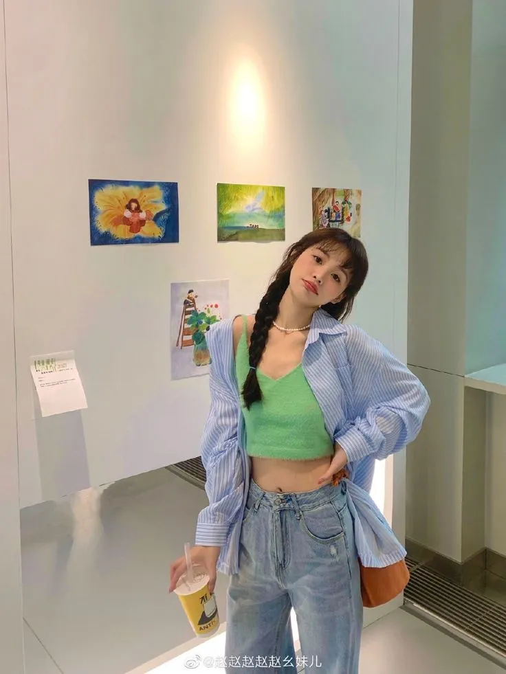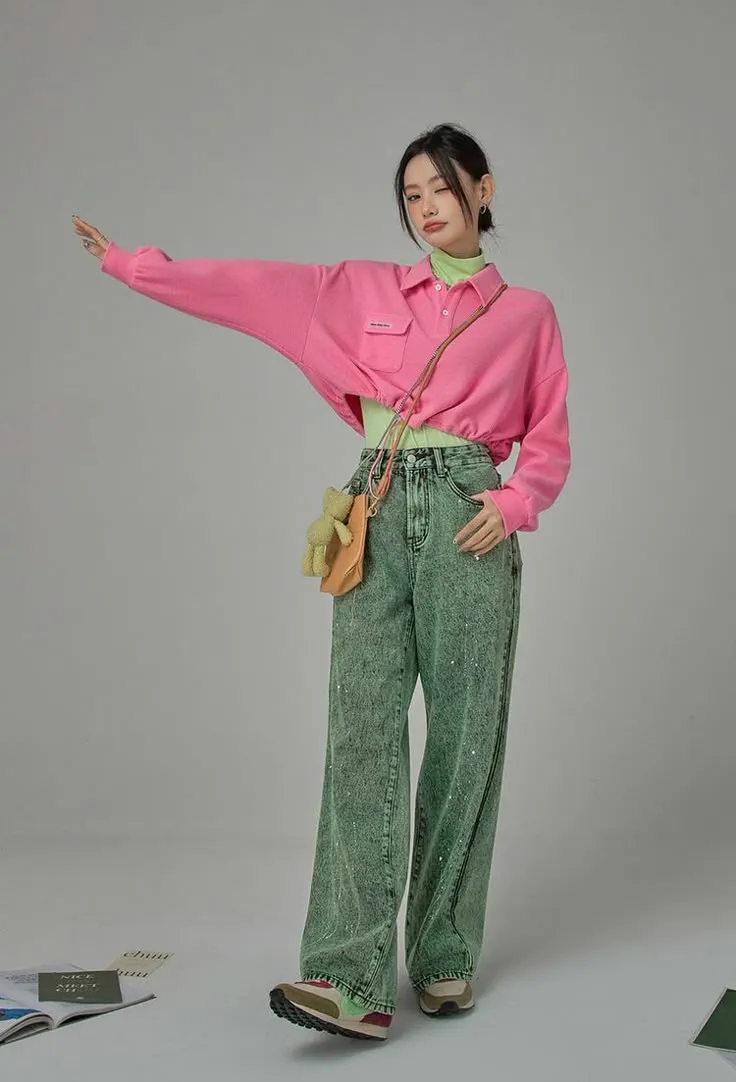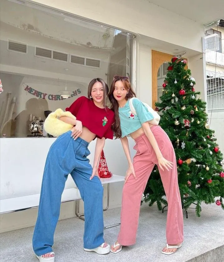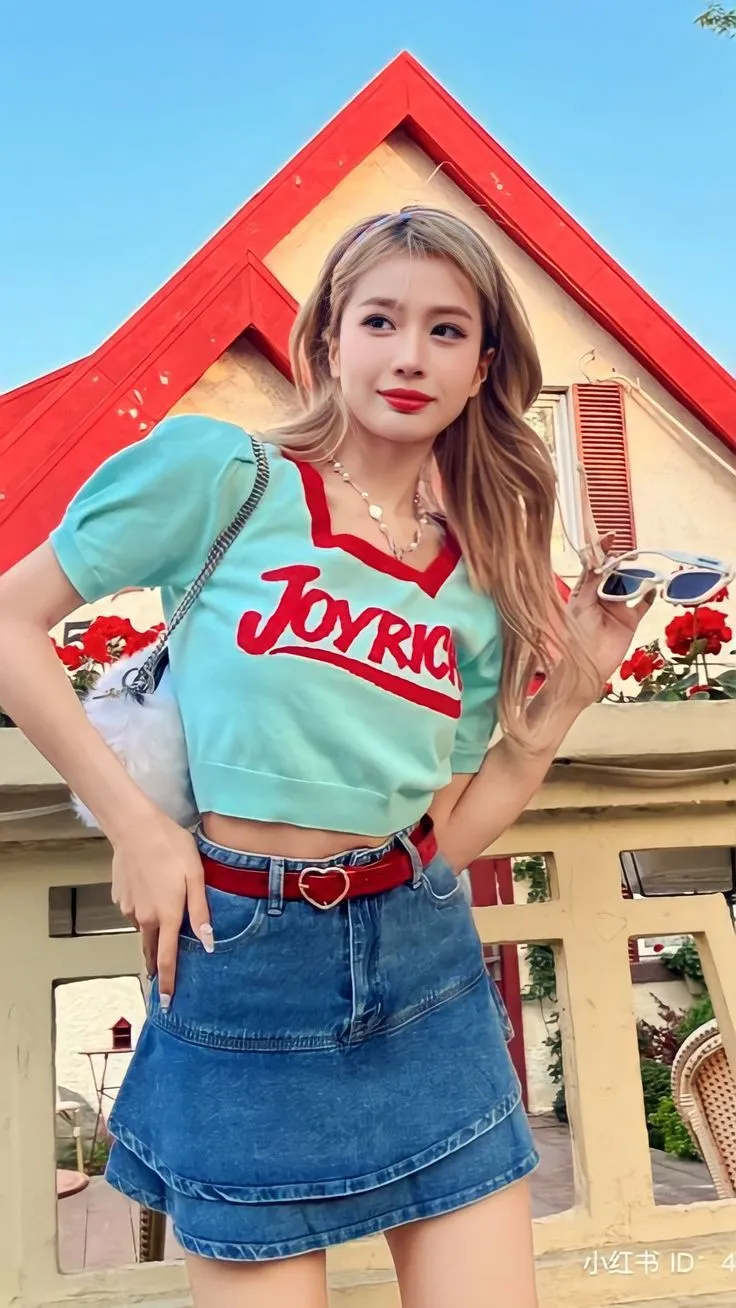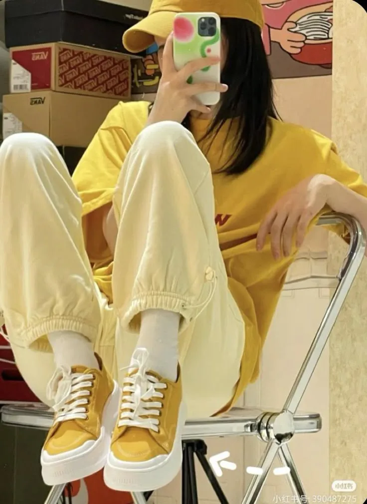 - ผู้หญิง: เสื้อครอปสีเหลือง + กางเกงยีนส์น้ำเงิน + รองเท้าสีแดง = ลุคแคชชวลน่ารัก