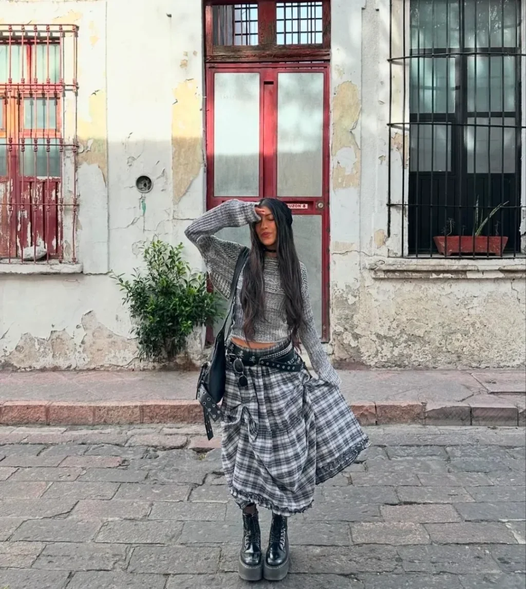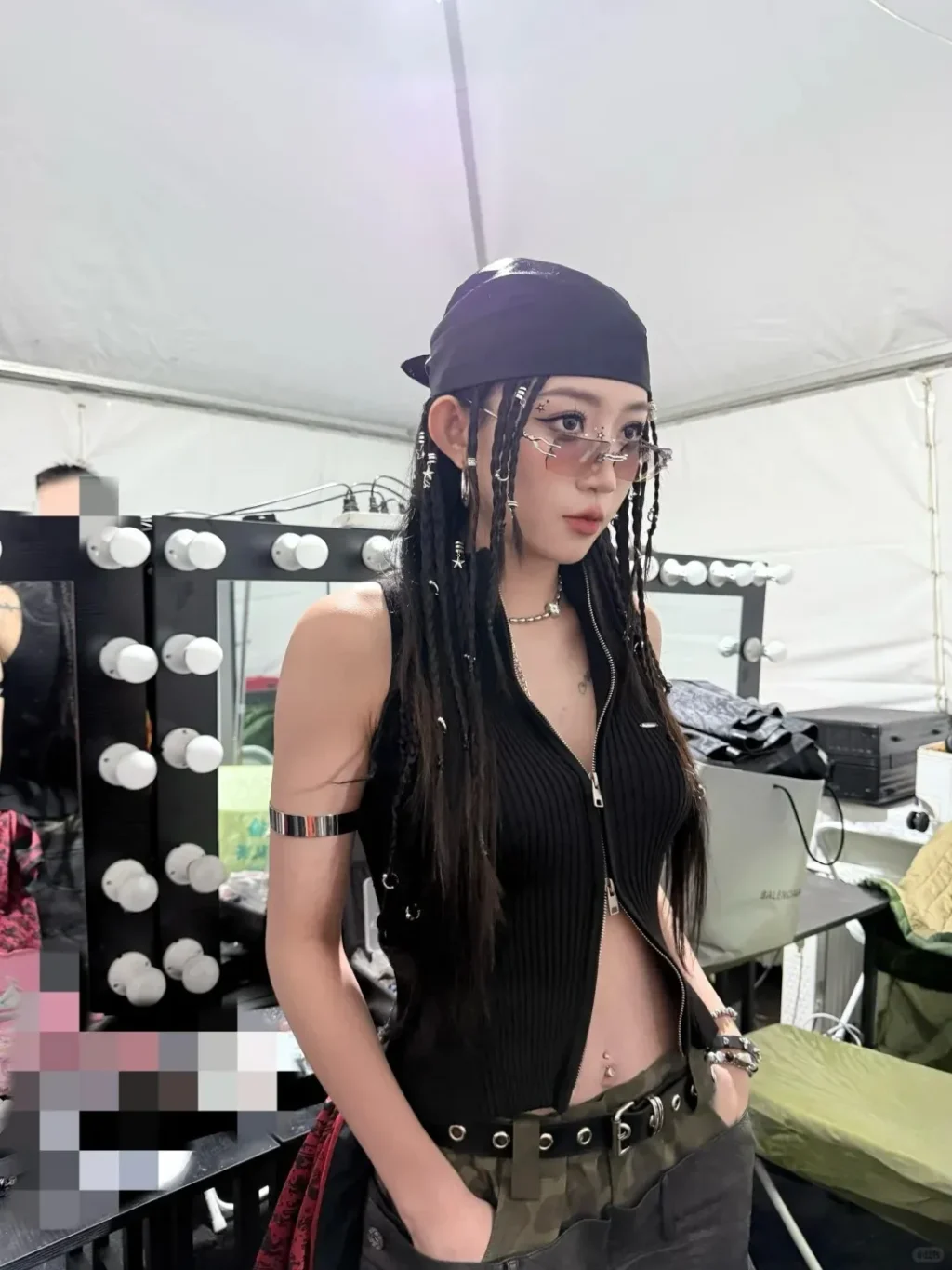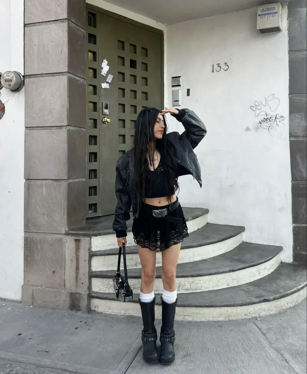แต่งหน้าโทนเข้ม อายไลเนอร์หนา และลิปสติกสีแดงเลือดหมู ช่วยขับลุคให้ดูร็อคแบบมีพลัง