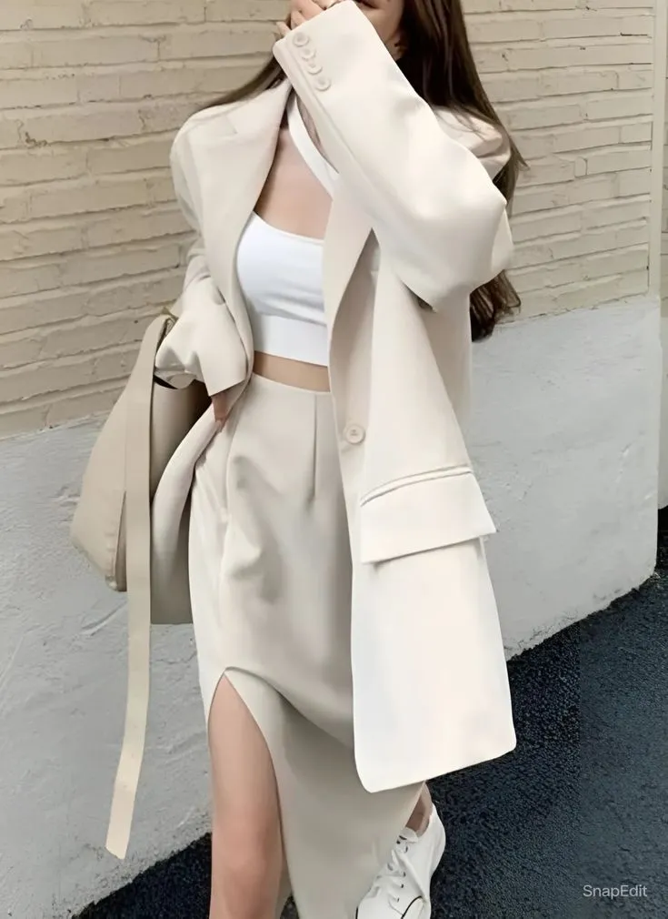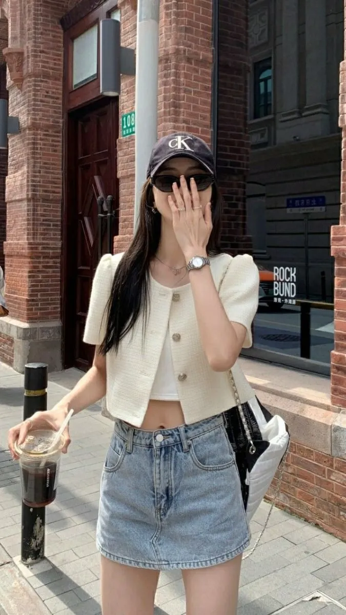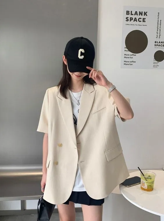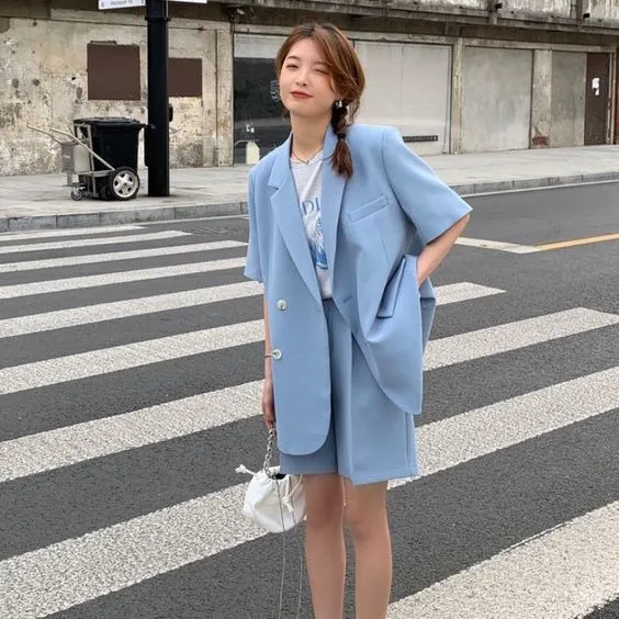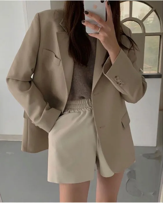 1. ลุคแฟชั่นแบบเรียบง่าย แมตช์เสื้อแฟชั่นกับกางเกงขาสั้น คลุมทับด้วยเบลเซอร์อีกที พร้อมใส่รองเท้าแตะสีน้ำตาลสไตล์มินิมอล จะได้ลุคแฟชั่นที่สวยหรูดูแพง