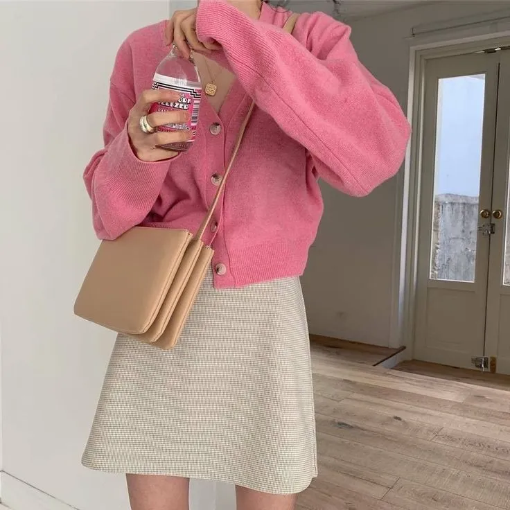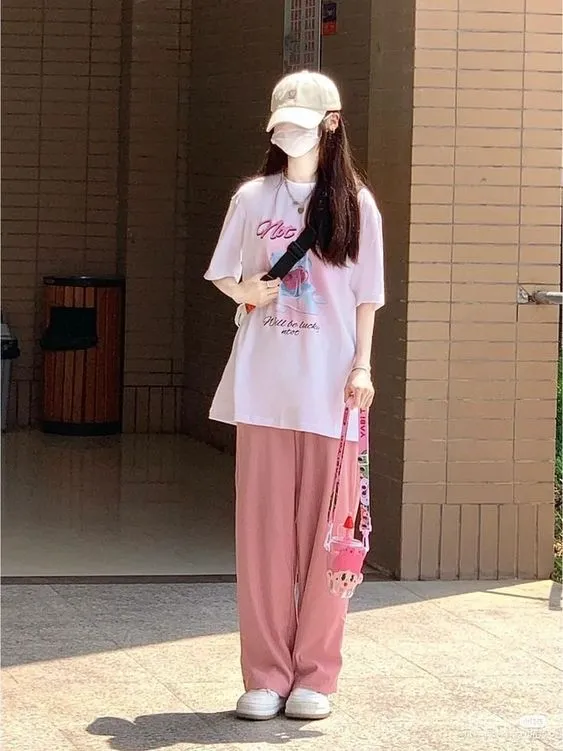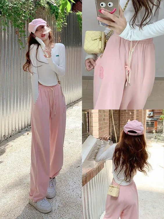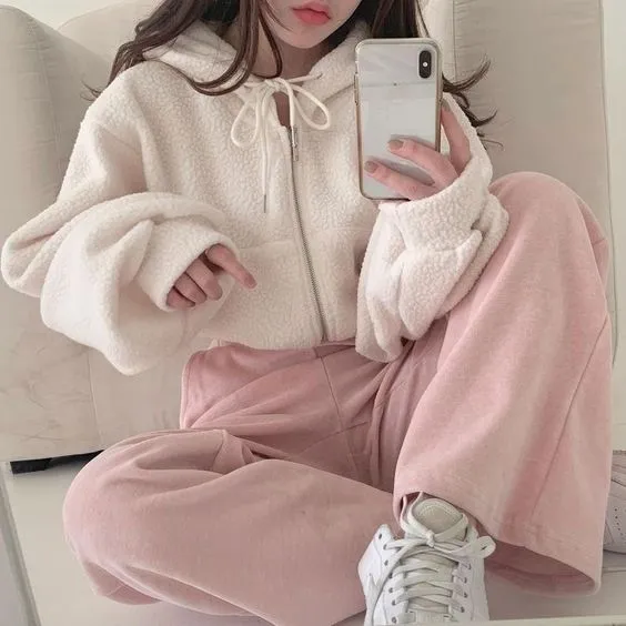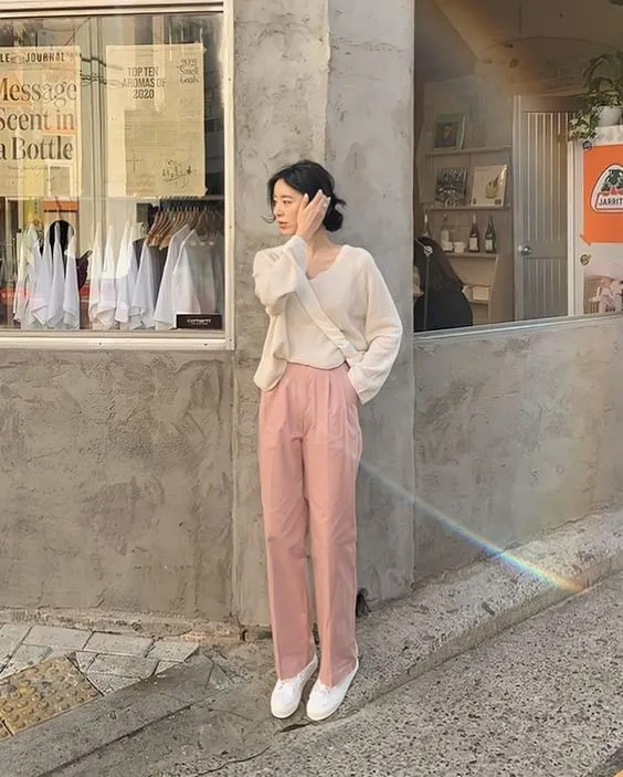 3. ลุคมินิมอลสไตล์ลูกคุณหนู แมตช์เสื้อคาร์ดิแกนสีขาวกับกางเกงวอร์มสีชมพูพาสเทล พร้อมใส่รองเท้าผ้าใบคุมโทนสีขาว จะได้ลุคมินิมอลสวยแพงสไตล์ลูกคุณหนู