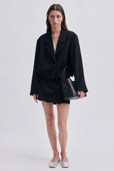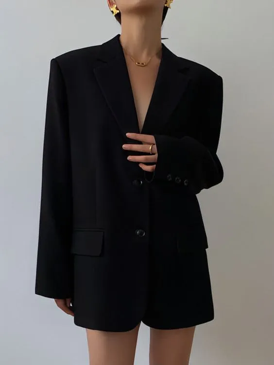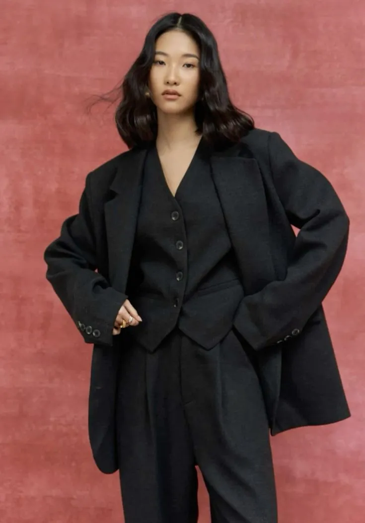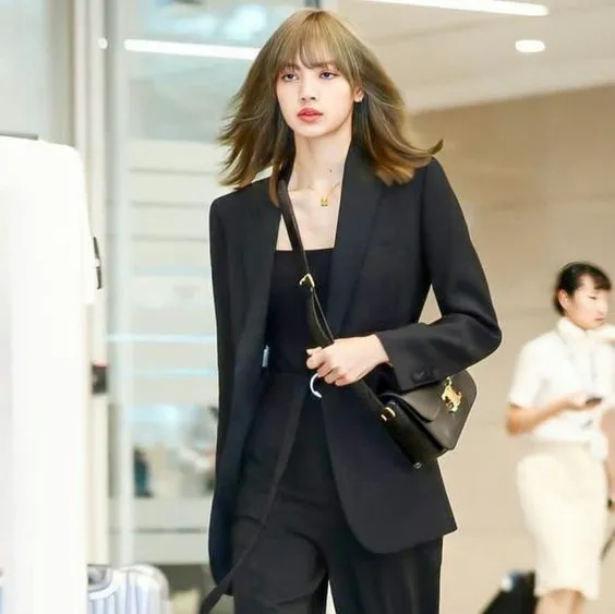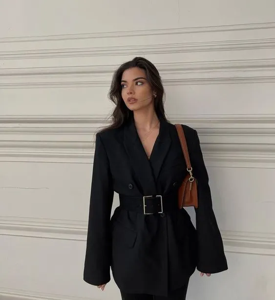 4. ลุคนักธุรกิจสาว แมตช์เสื้อเกาะอกกับกางเกงสีดำ คลุมทับด้วยเบลเซอร์สีดำ อาจจะใส่แว่นกันแดดพร้อมรองเท้าลำลองสตรีแบบชิค ๆ ช่วยให้ลุคโดยรวมดูแพงแบบนักธุรกิจสาว