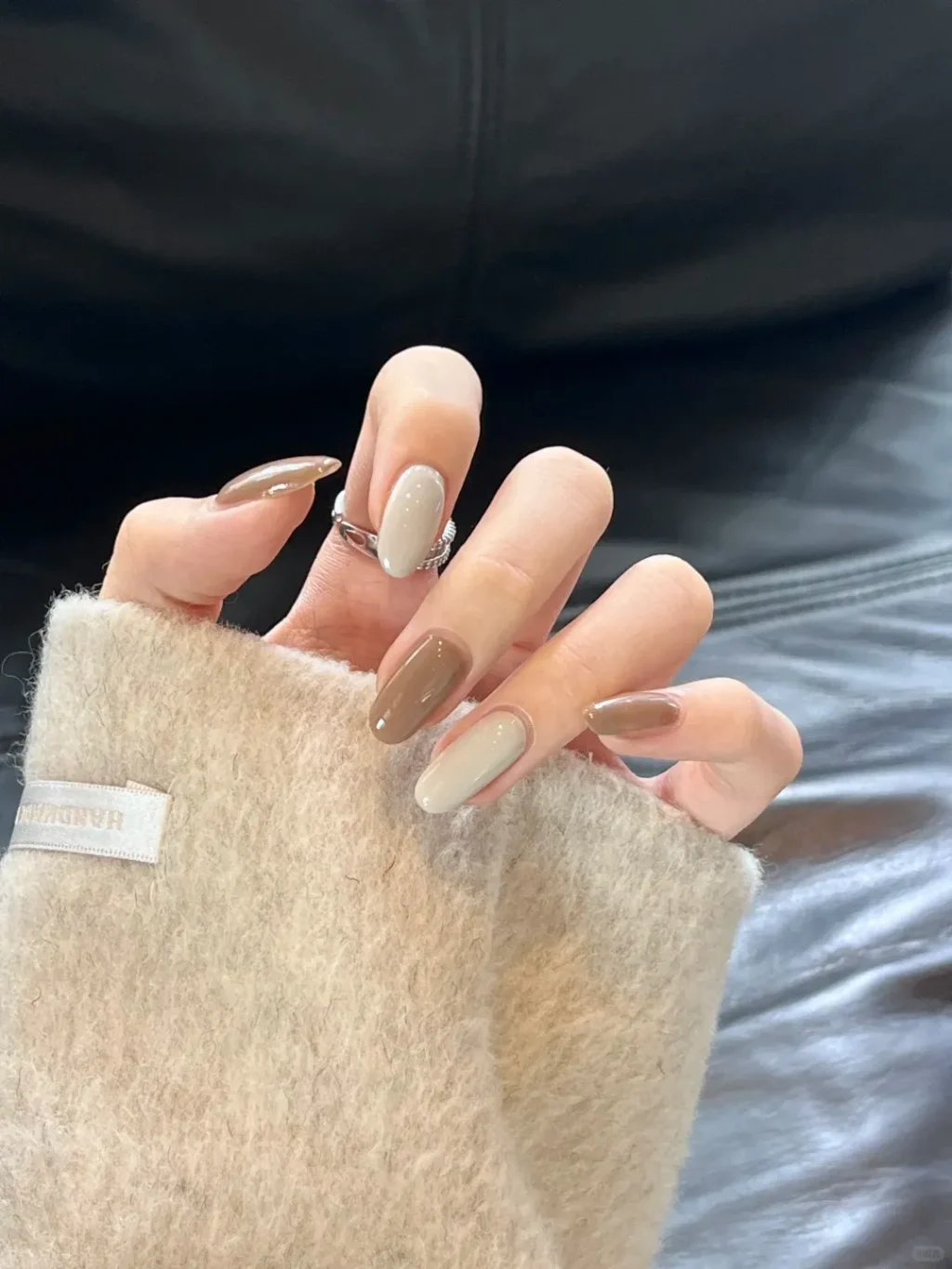 - สีเบจหรือสีน้ำตาลอ่อน จะเหมาะมาก ๆ กับคนที่ต้องการตกแต่งเล็บด้วยสีที่เรียบง่าย แต่อยากให้เล็บดูดี ดูหรูหราและมีสไตล์