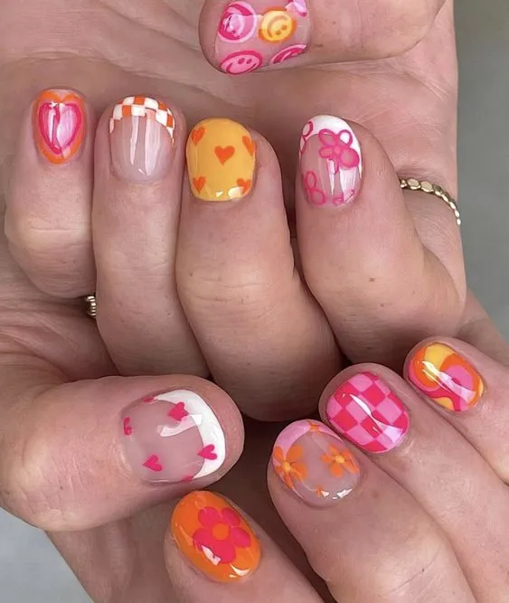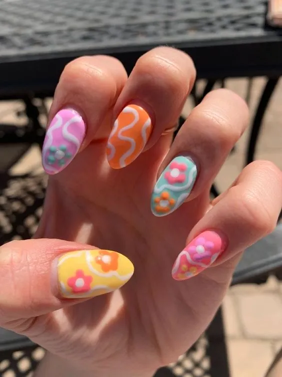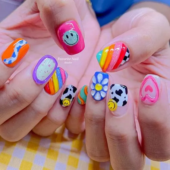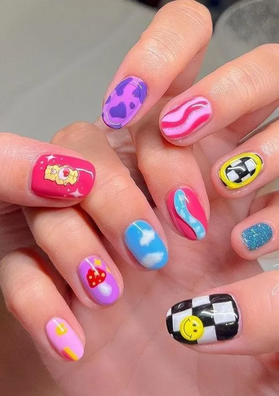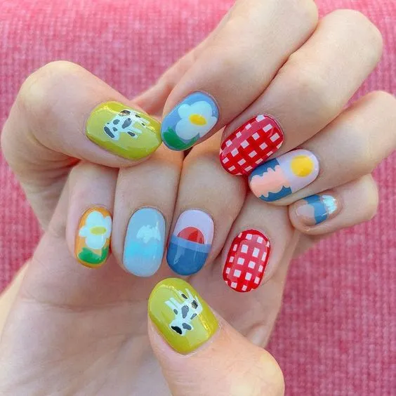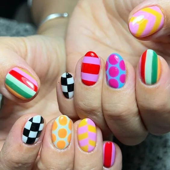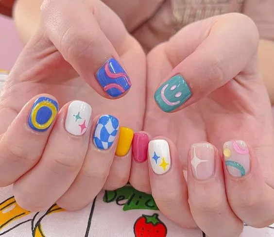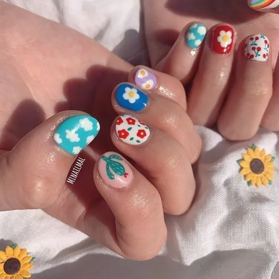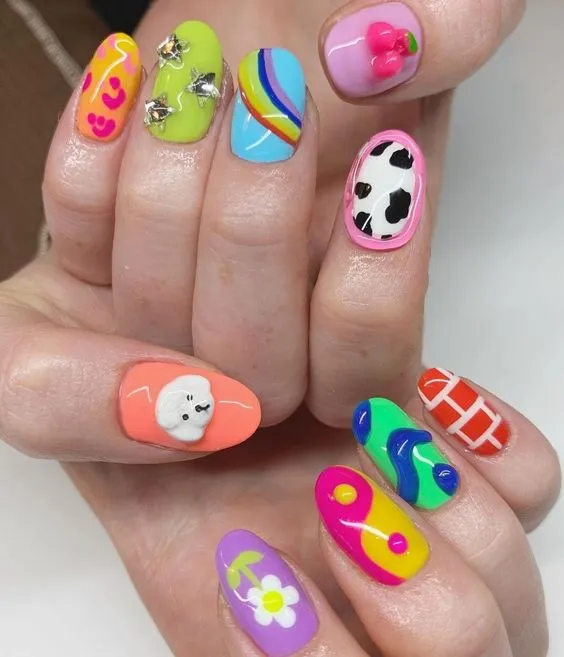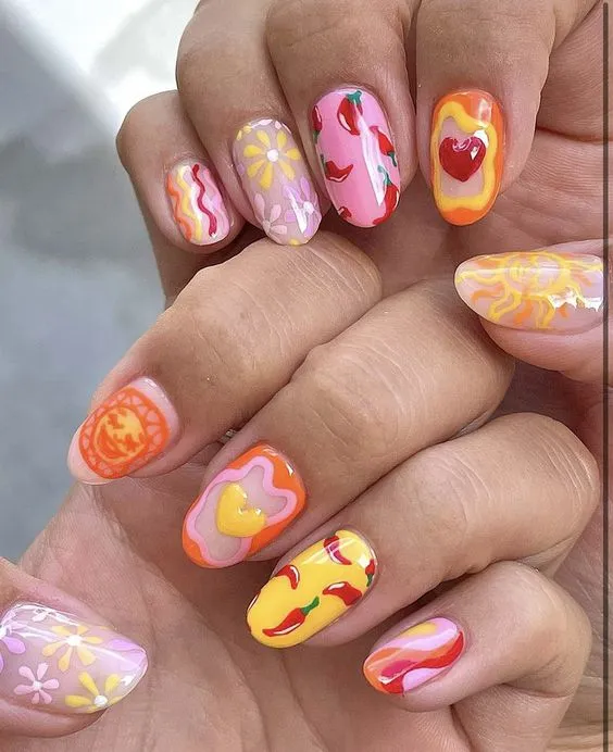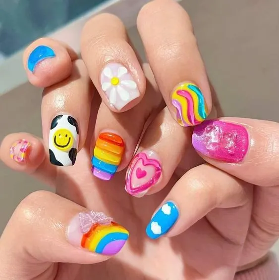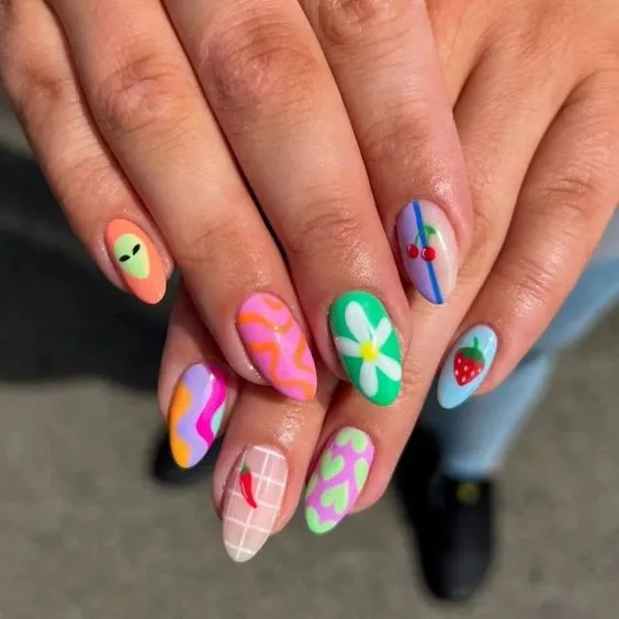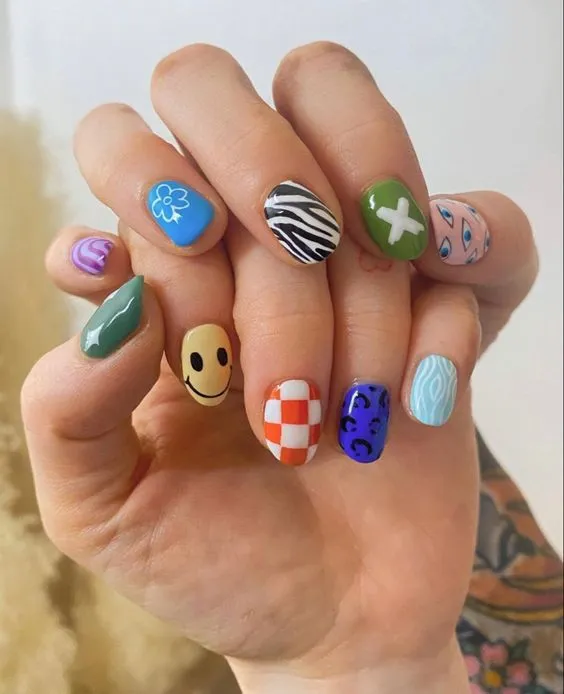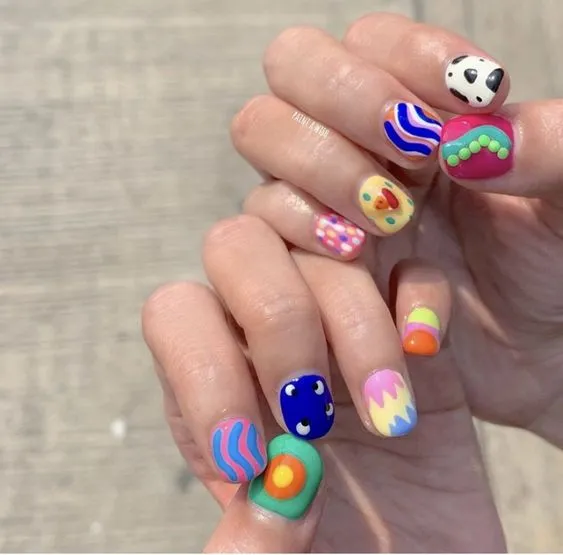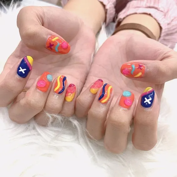 โดยเล็บลายนี้จะมาในรูปแบบของ ลายเล็บคัลเลอร์ฟูล ที่มีความสดใส ให้เหมาะกับหน้าร้อนนี้ พร้อมสำหรับเที่ยวทะเลแบบชิลๆ คูลๆ โดยจะไม่เพ้นท์ให้เหมือนกันแบบครบทุกสี เพราะหากทำเช่นนั้น ก็จะดูธรรมดาจนเกินไป ซึ่งก็อาจจะทำให้คุณรู้สึกไม่พอใจเท่าที่ควร ยิ่งใครที่เป็นสายชาเลนจ์ หรือชอบลองอะไรใหม่ ๆ ลายนี้ถือว่าเหมาะสมเป็นอย่างมากเลยทีเดียว แต่ทริคแนะนำเลยก็คือ หากจะเพ้นท์ลายให้มีความต่างกันในแต่ละเล็บ ก็ไม่ควรที่จะเพ้นท์ให้ลายต่างกันมากเกินไปนั่นเอง เพราะอาจทำให้ลายดูไม่บาลานซ์กัน และโดดจนเกินไป
