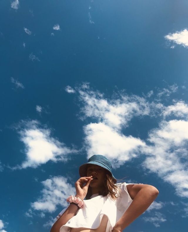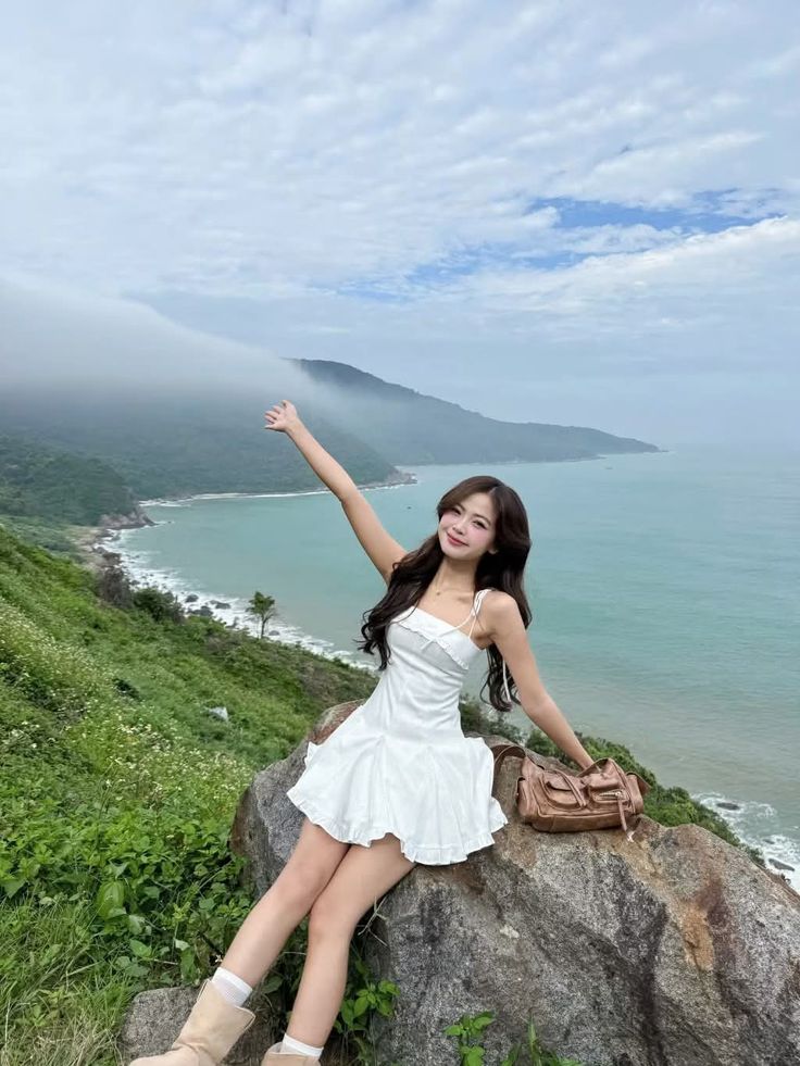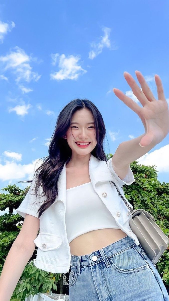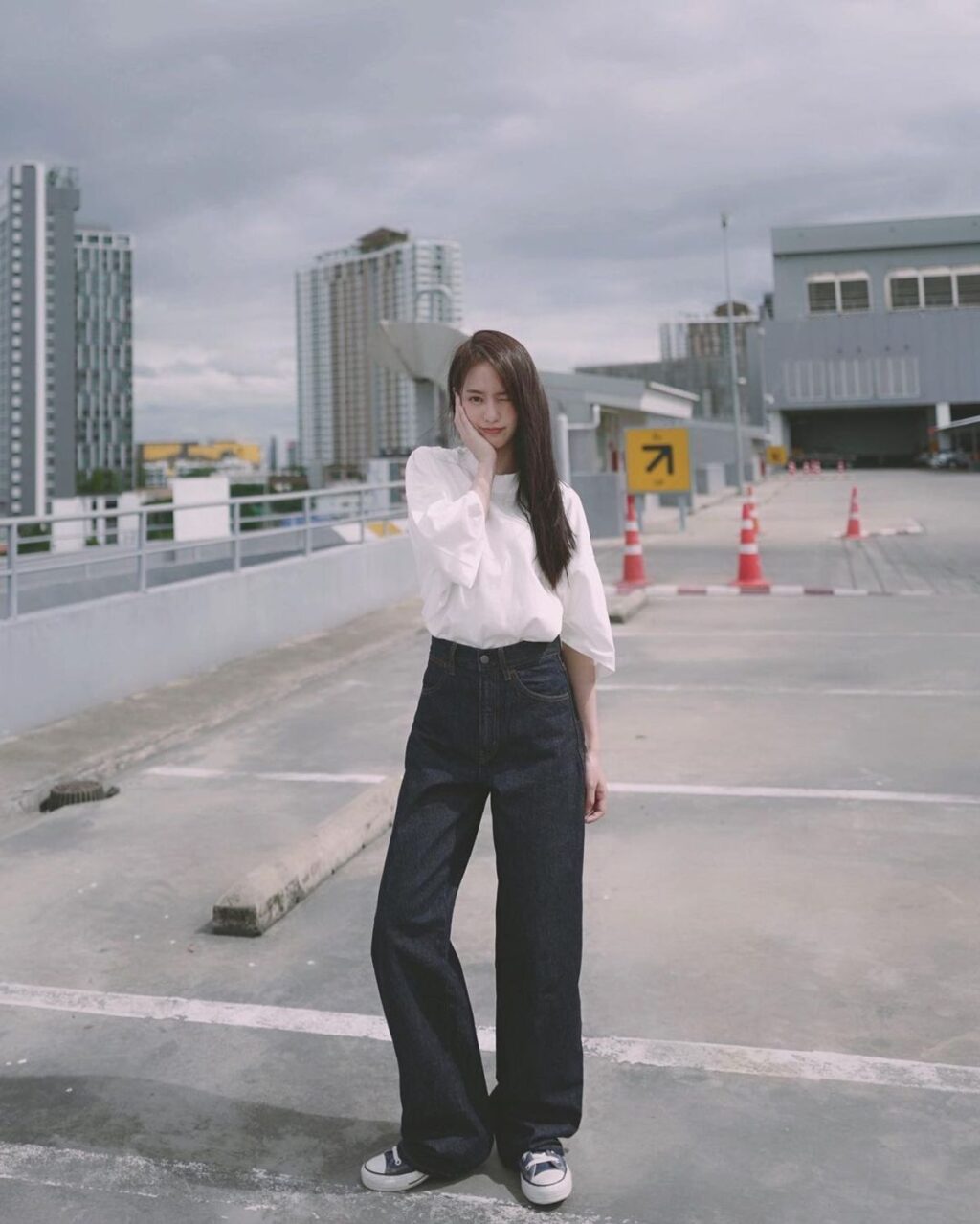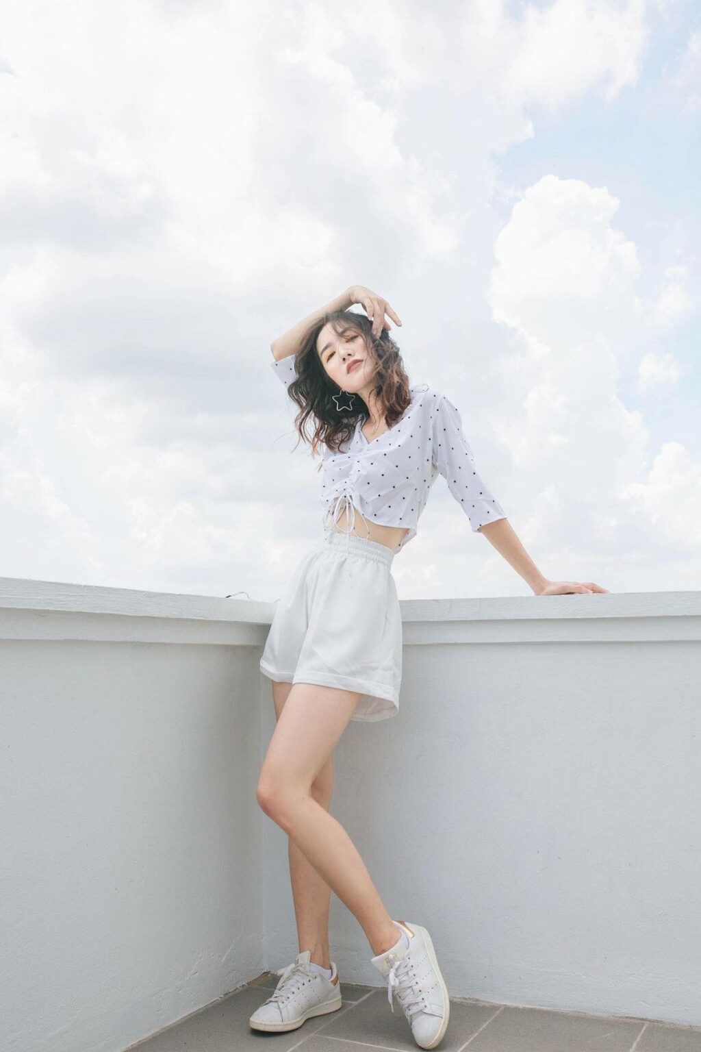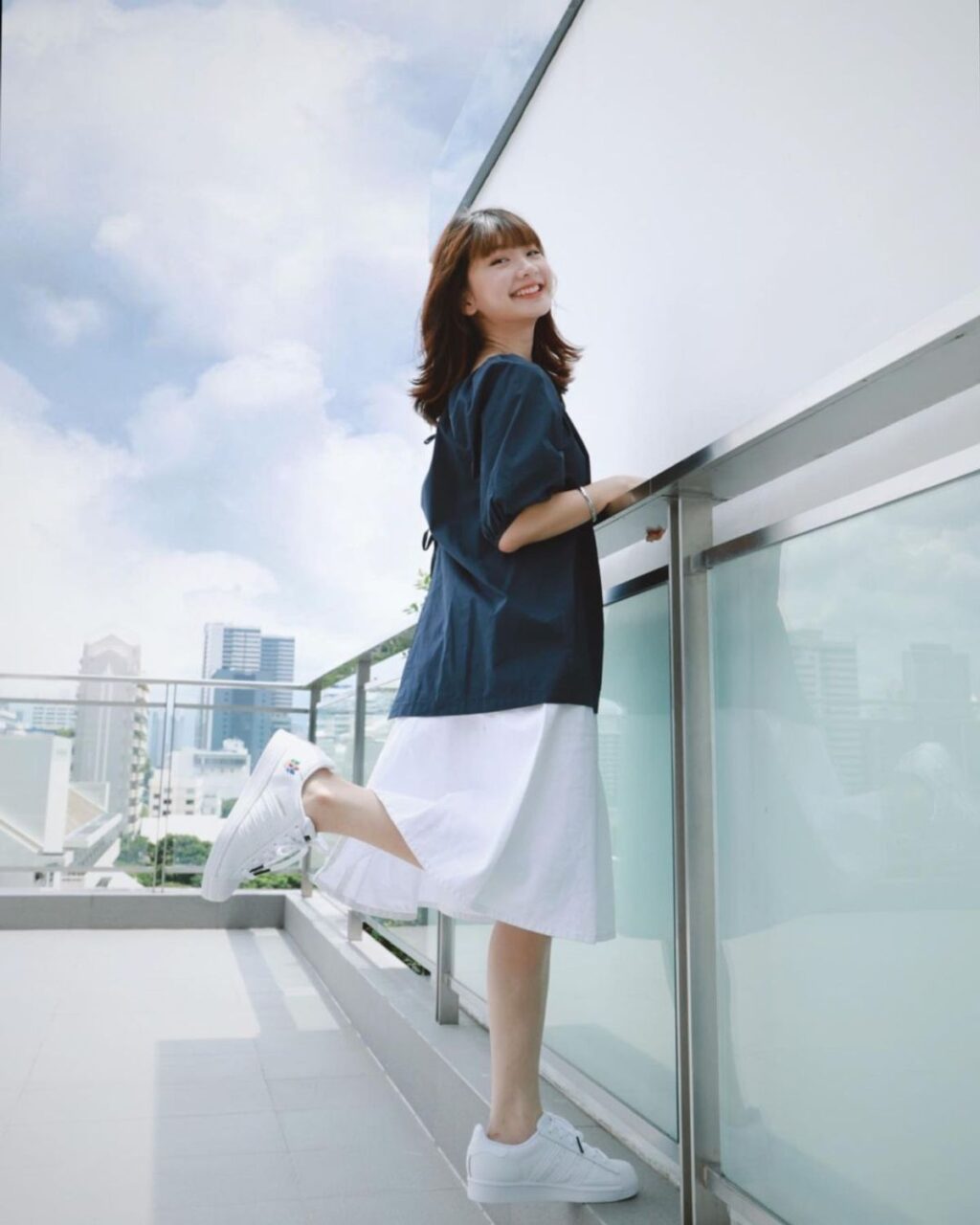 ถ้าอยู่ดาดฟ้าหรือจุดชมวิว ลองเปิดเฟรมให้เห็นทั้งท้องฟ้าและวิวด้านหลัง ภาพจะได้ความรู้สึกโมเดิร์น ดูมีสเกล และให้บรรยากาศแบบสาวเมืองที่รักอิสระ