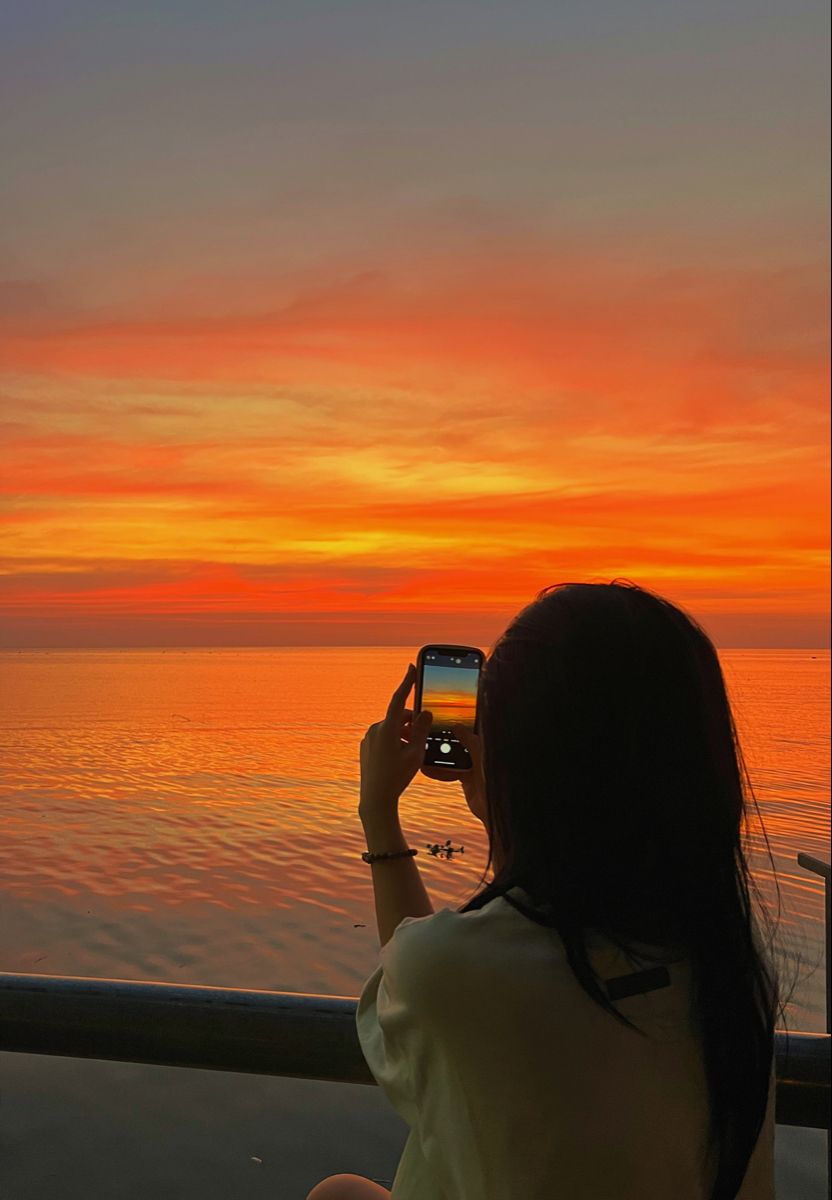 การถ่ายย้อนแสงช่วงเย็นจะช่วยขับสีของท้องฟ้าให้ชัดขึ้น เงาร่างบาง ๆ กับพื้นหลังที่เป็นเส้นขอบฟ้าจะทำให้ภาพดูมีมิติ และให้ฟีลซิลูเอตที่ดูเท่แบบไม่ต้องแต่งเยอะ