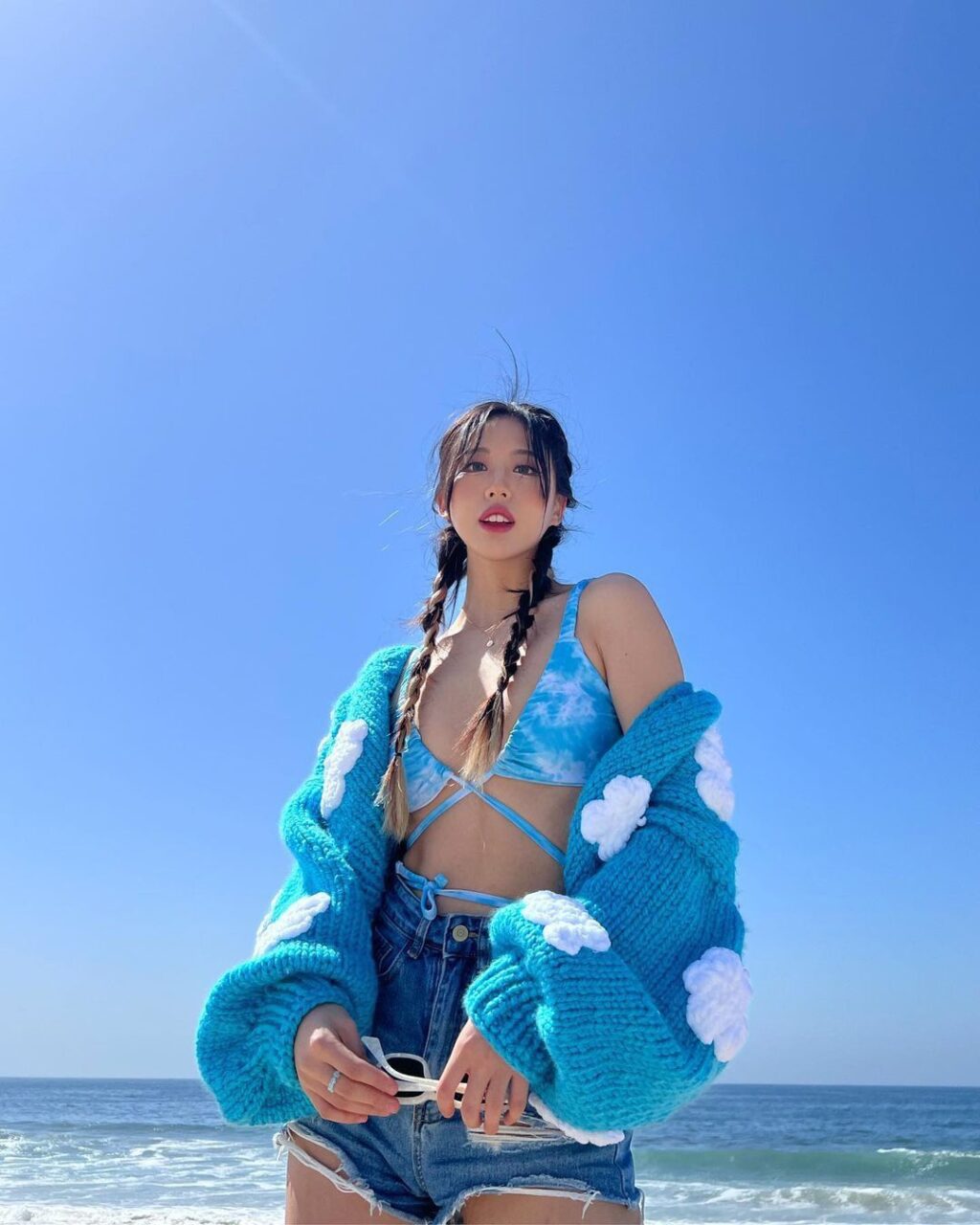 เสื้อผ้าโทนขาว ครีม หรือพาสเทล จะช่วยให้ภาพดูสะอาดและละมุน ถ้าอยากเพิ่มความสดใส ลองเลือกสีที่ตัดกับฟ้าเล็กน้อย เช่น ส้มอ่อนหรือชมพู จะช่วยให้ภาพโดดเด่นขึ้นแบบพอดี ๆ